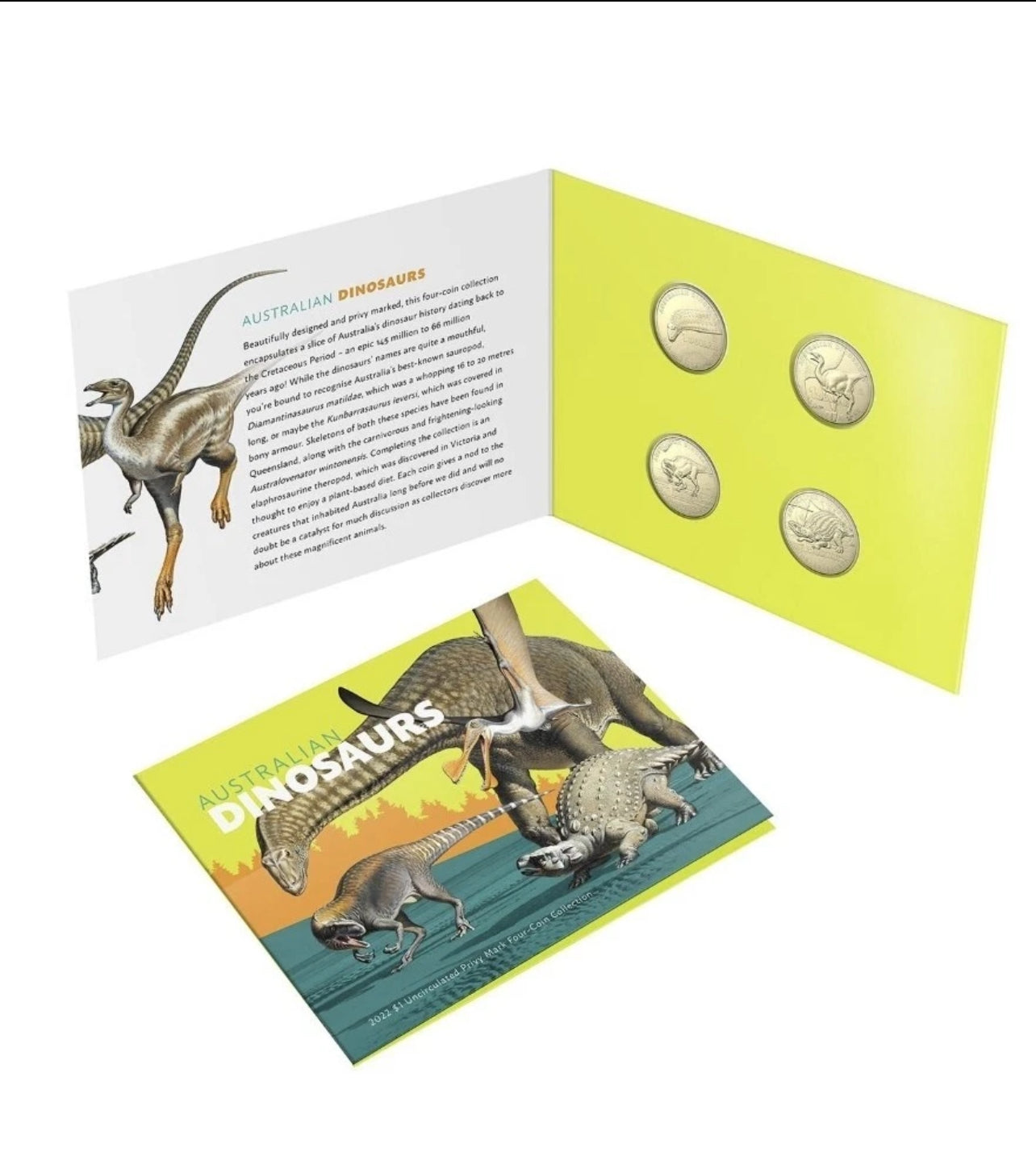 Here’s a visual showcase of the 2022 $1 Uncirculated Privy Mark Four‑Coin Collection—a beautifully packaged set from the Royal Australian Mint, featuring four aluminium‑bronze coins adorned with dinosaur designs and privy marks that spell "D I N O".
