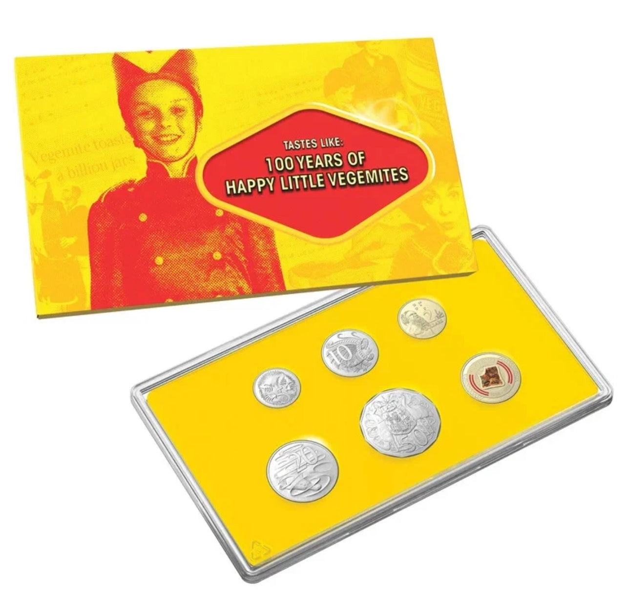 Six‑Coin Uncirculated Year Set—celebrating a century of iconic Aussie goodness with a colourful $1 Vegemite-on-toast coin in mint-condition uncirculated quality.