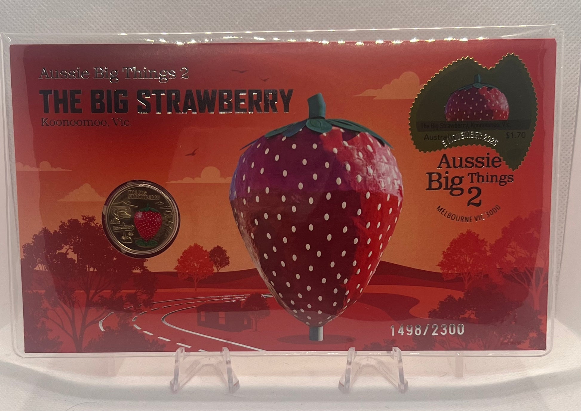 This stamp and coin cover is a limited edition of 1498/2,300. It includes a coloured uncirculated Aussie Big Things 2 coin from the royal Australian Mint.