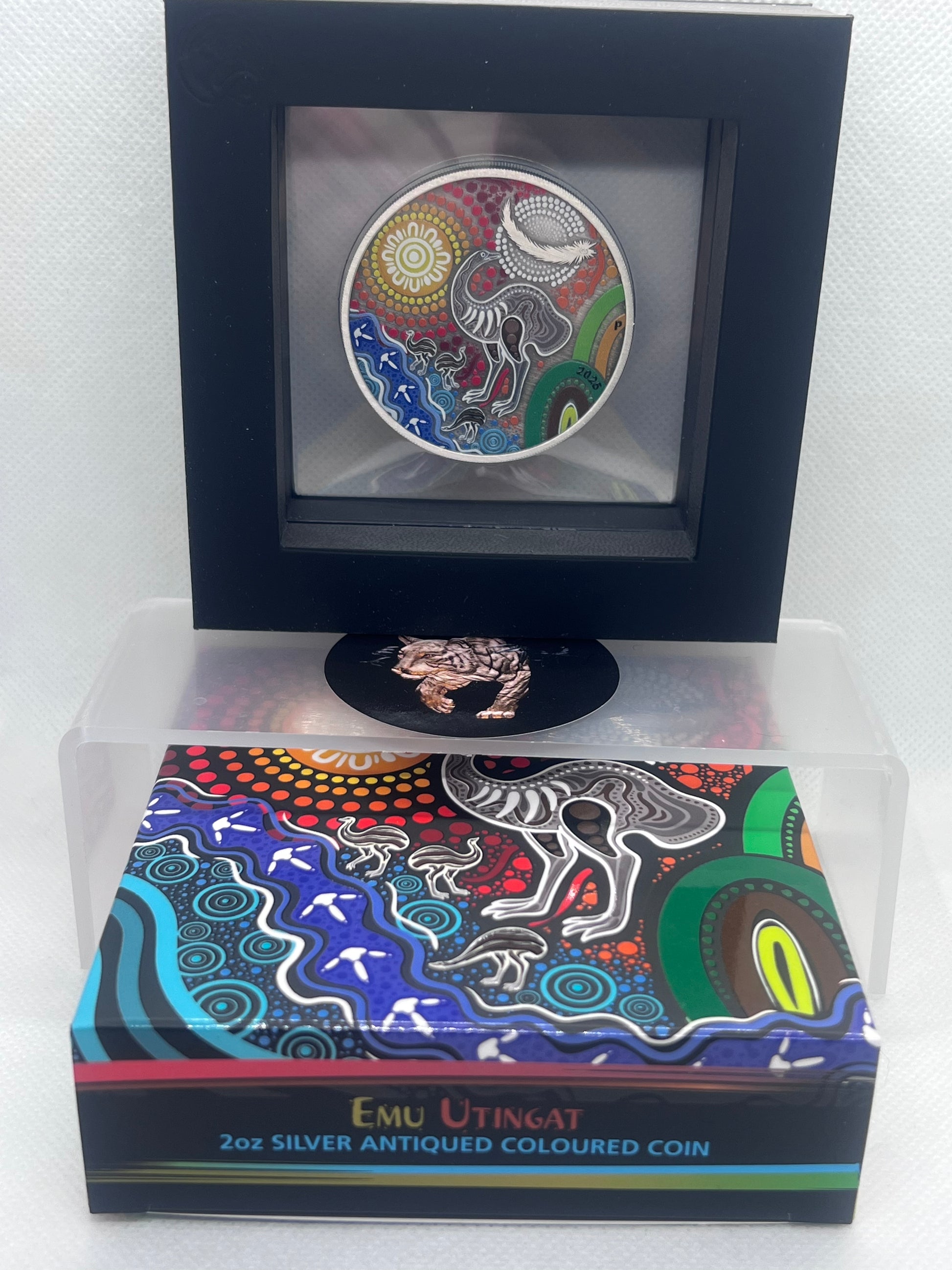 The fourth coin in the set , The Emu Utingat 2025 2oz Silver Antiqued Coloured Coin continues Perth Mint's series of Aboriginal style painted coins. The emu, known as “Utingat” in the Kalkadoon language, is Australia’s largest native bird. Previous releases in this series, including the Black Swan Maali, Kangaroo Yongka, and Kookaburra Kaa Kaa.